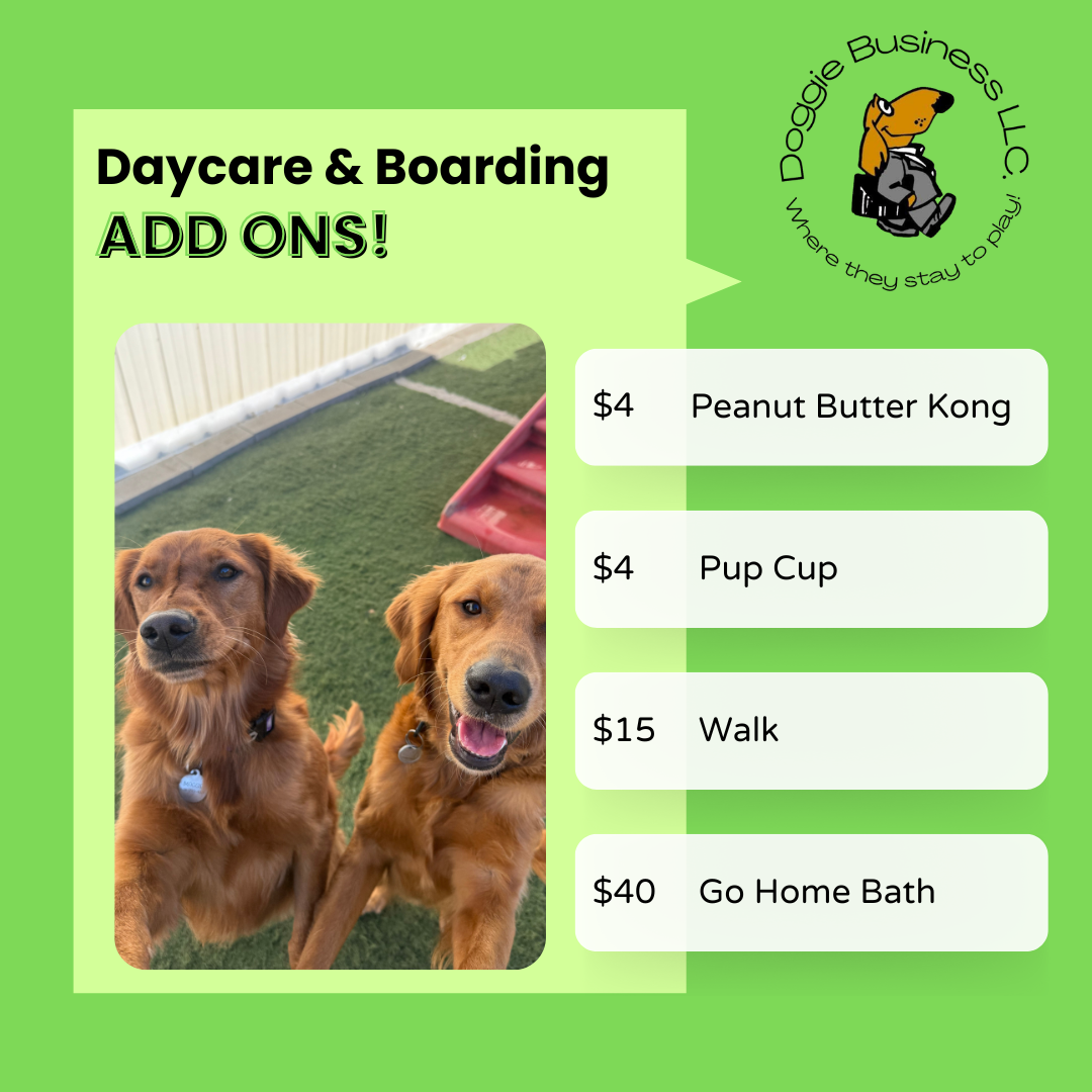 Make your dog’s daycare or boarding stay even more special with our fun add-ons! From tasty treats like a Peanut Butter Kong or Pup Cup, to extra enrichment with a one-on-one walk, or sending your pup home fresh with a Go Home Bath, these extras are the perfect way to add a little more love to their day.