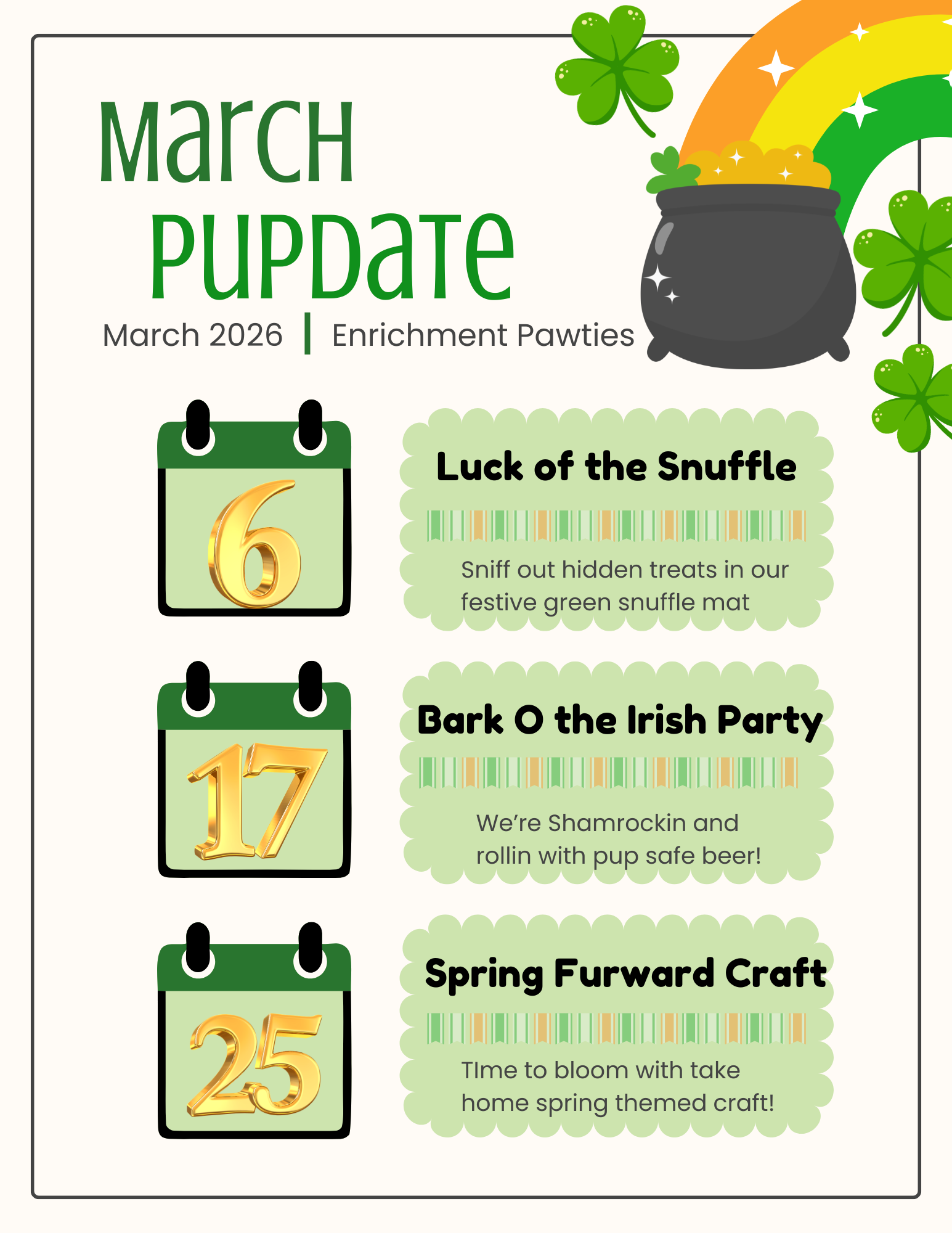 Our February enrichment events are the perfect way to keep your pup engaged, happy, and learning through fun, stimulating activities. These events are designed to support your dog’s mental and physical well-being in a safe, social environment. To sign your pup up, simply email us or give us a call—we’d love to have them join the fun!