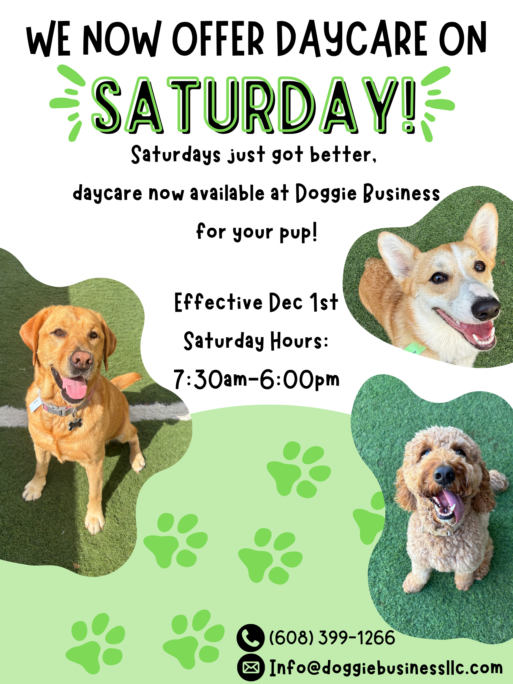 We’re excited to announce that we now offer Saturday daycare at Doggie Business! Starting December 1st, your pup can enjoy a fun, safe day of play every Saturday from 7:30 a.m. to 6:00 p.m. Saturdays just got better—perfect for busy weekends while your dog gets the care and enrichment they love.