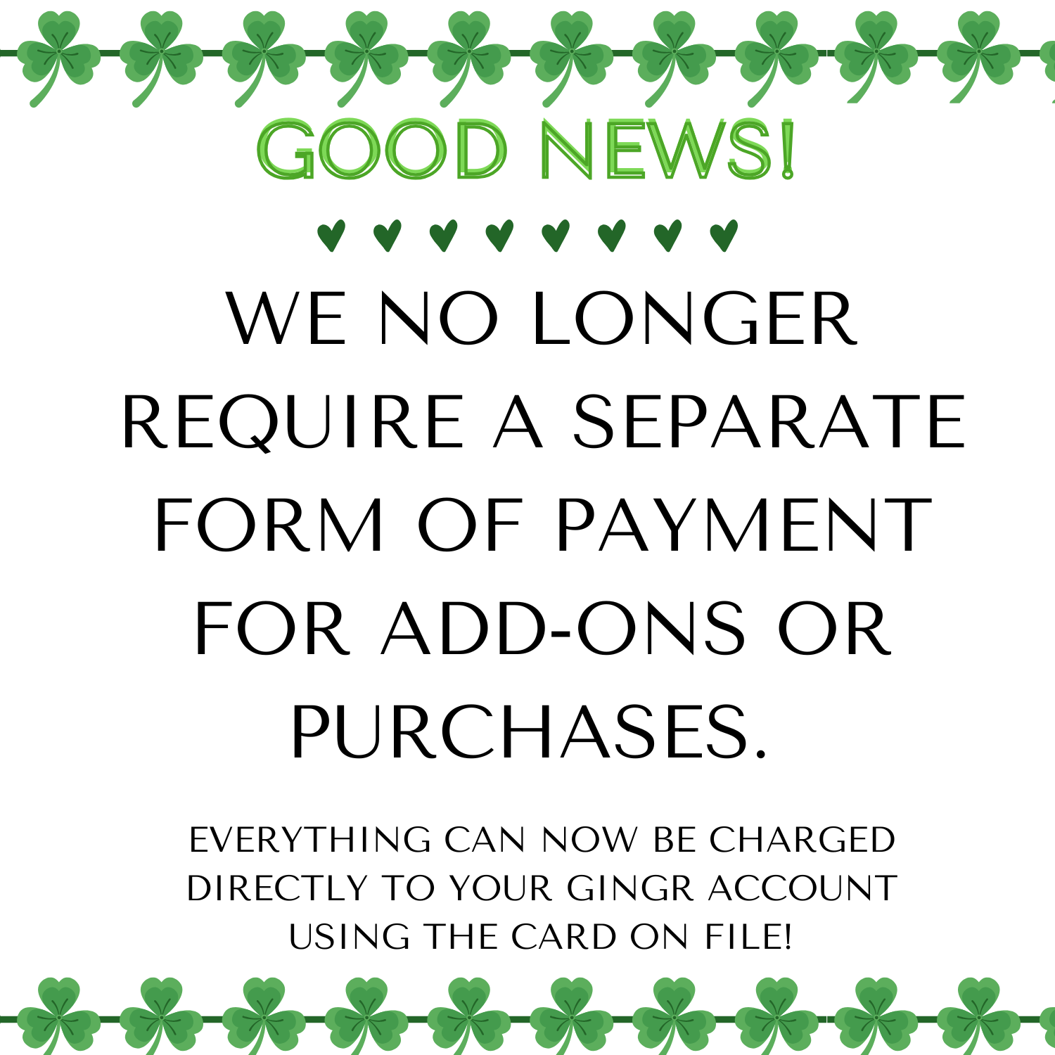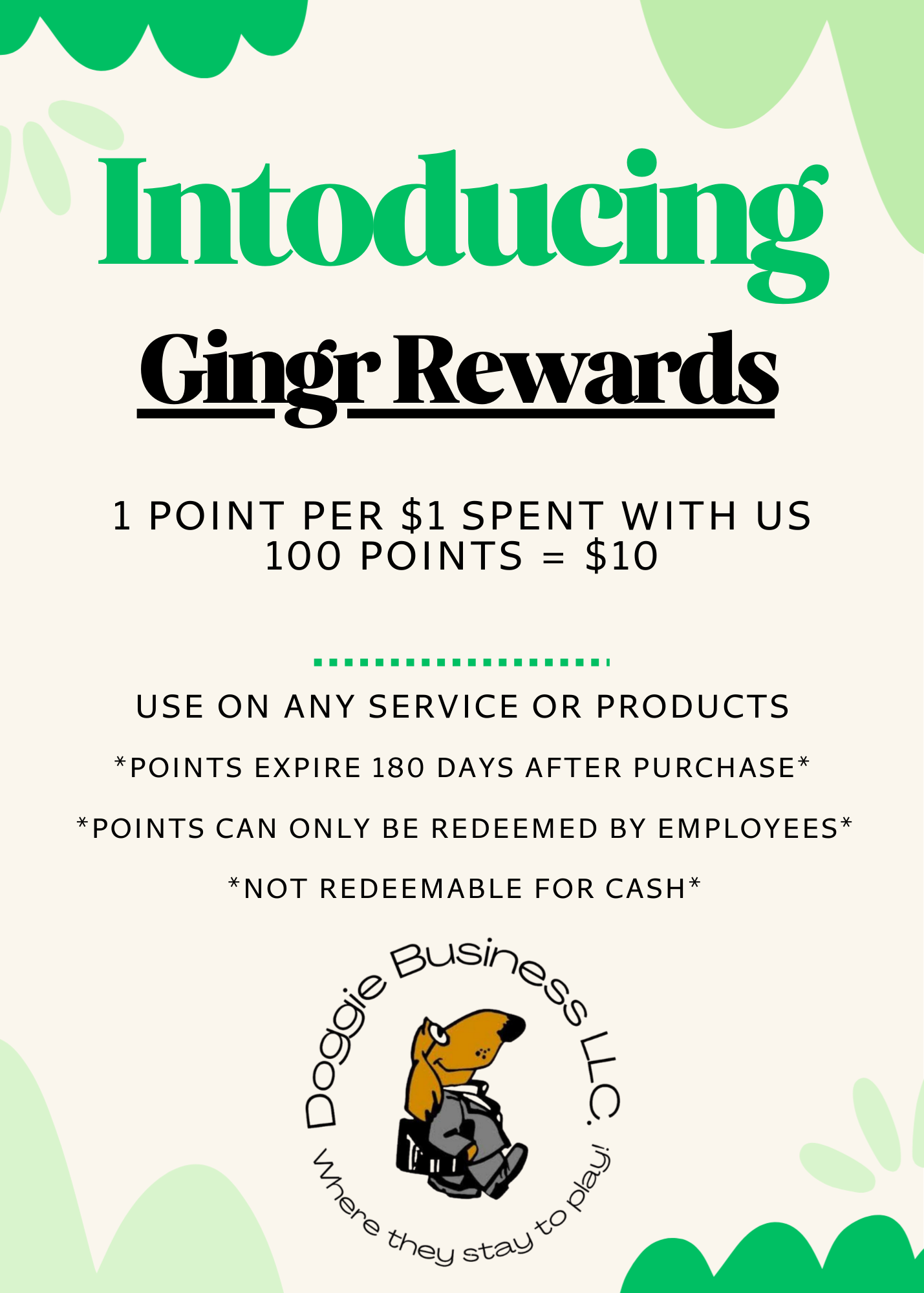 We’re excited to introduce Gingr Rewards! Earn 1 point for every $1 you spend with us, and once you reach 100 points, you’ll receive $10 to use toward any service or product. Points are valid for 180 days from purchase and must be redeemed through our team. It’s our way of saying thank you for choosing us—because loyalty should be rewarded!