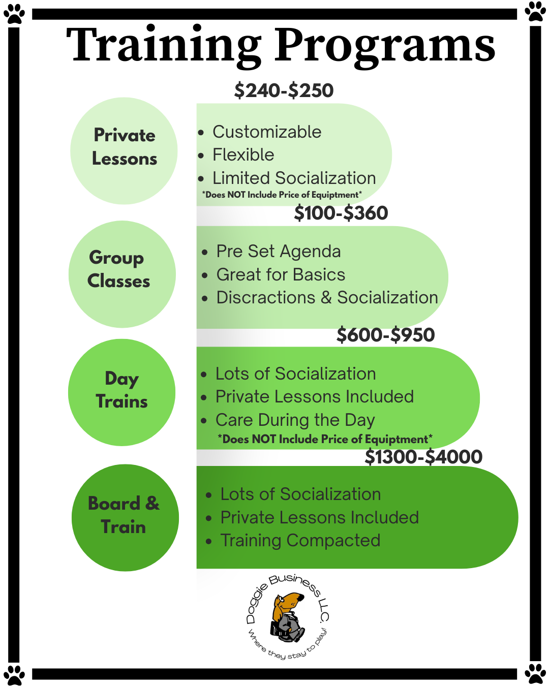 Explore our four types of training programs with key highlights, pricing, and what each offers. From group classes to private lessons, we make it easy to choose the perfect program to set your dog up for success. Contact us for more information!